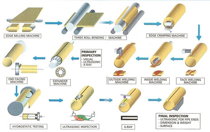 Pipes are formed starting from the plate set in the edge milling machine and rolled in the three-roll bending machine designed by Haeusler from Switzerland. The rolled cylinder is then processed into the edge crimping machine prior to tack welding. Tandems inside SAW and outside SAW are then performed to ensure a joint efficiency factor of 1. Mechanical expanding is conducted next for 0.8%-1.5% expansion ratio to relieve the pipe of its accumulated stresses during forming and welding processes. Mechanical expanding enhances the dimensional parameters. Hydrostatic testing, ultrasonic inspection, X-ray inspection, and final, visual and dimensional inspections are also conducted. The mill proven capability for producing high strength heavy wall line pipe is up to X70.